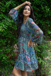 Embrace effortless bohemian elegance with the Sacred Threads Imperial Chiffon Bohemian Mini Dress. This enchanting dress features a vibrant paisley print that dances across the lightweight chiffon fabric, creating a look that is both whimsical and sophisticated. The smocked bodice provides a flattering fit, while the billowy long sleeves add a touch of romantic charm. The flared skirt falls gracefully, making it perfect for twirling at festivals or casual gatherings.